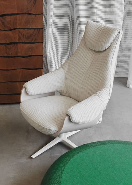 Upon the announcement of their new posts at Leolux, the brand unveiled two pieces by Studio Truly Truly: the Cream armchair, made with a wooden plywood shell in walnut or oak and upholstered in a soft fabric or leather; and the Klaar occasional table, which was made in collaboration with the Dutch Glass Museum in Leerdam, and sees each glass table handblown – resulting in a unique patina each time.