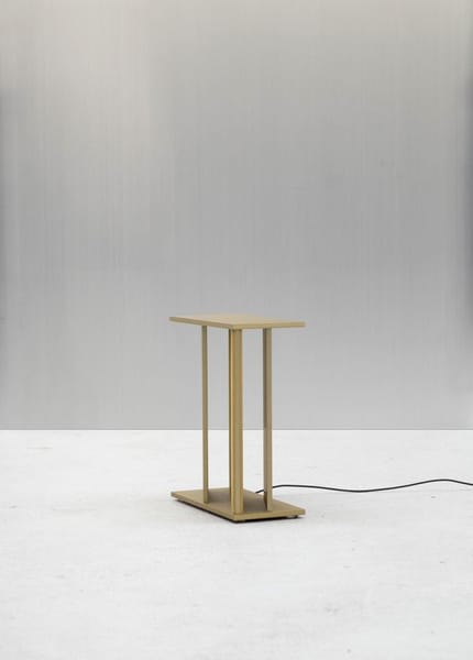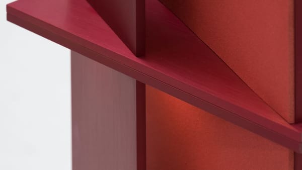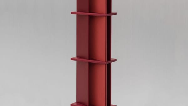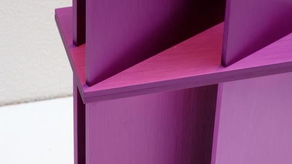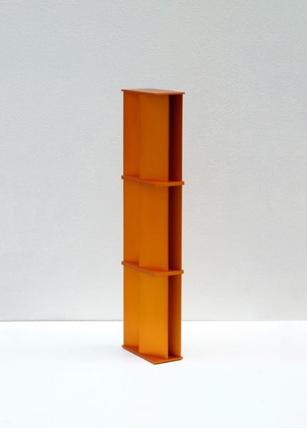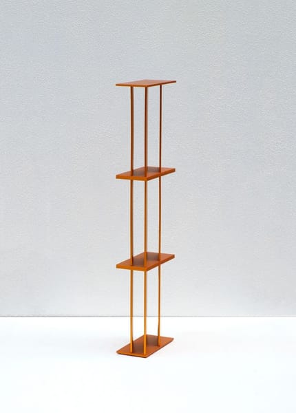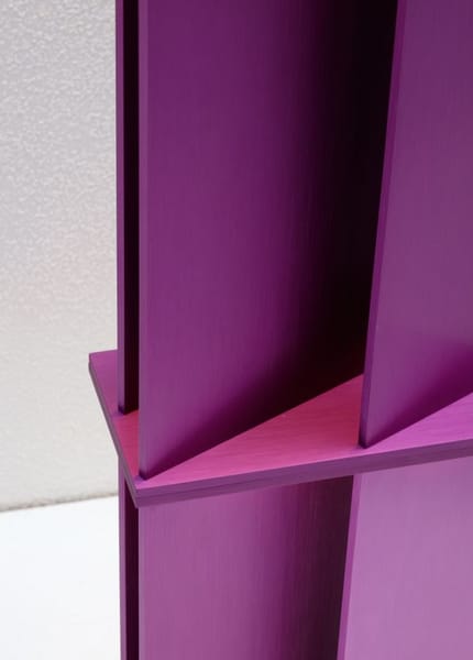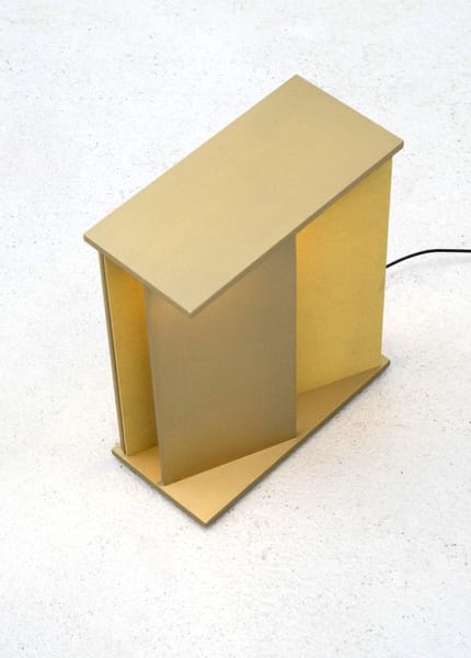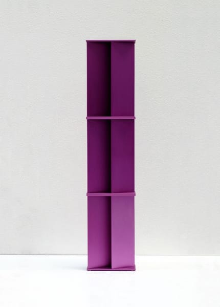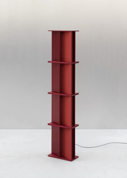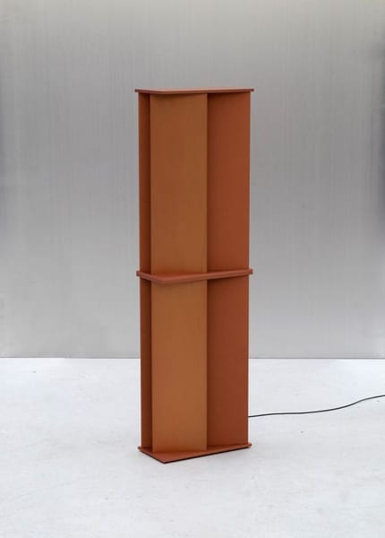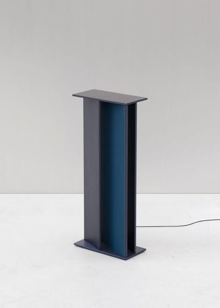 An exploration into light, form and space with coloured anodising. Column lights are illuminated architectural sculptures made in radiant metallic colour. Stacked in layers of angled panels; from one view, they appear very light and open, white another view looks dense with material. Ambient light streams from the top of each layer illuminating the metallic planes below.