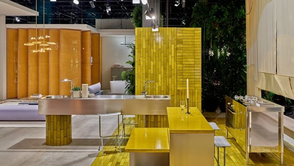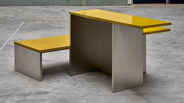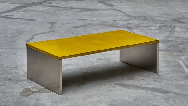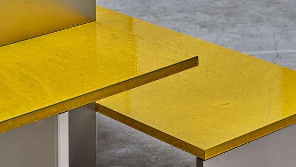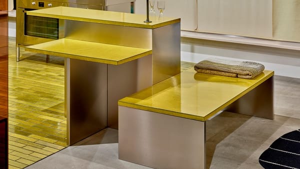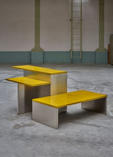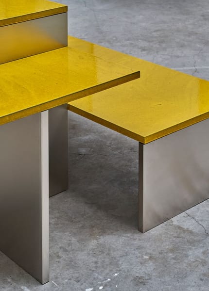 A kitchen island comprised of multiple levels, designed as the feature of 'Das Haus' 2019 - Truly Truly's vision of contemporary domestic living. Truly Truly deconstructed and opened up the typical kitchen layout to create a space that was inviting due to it's spaces and tactility. The warmth of the brightly glazed and organically textured lavastone tops is juxtaposed with gleaming stainless steel legs. The levels step down from counter height, table height to bench height, giving the object a flexibility that allows for sitting, leaning and communing in a range of ways.