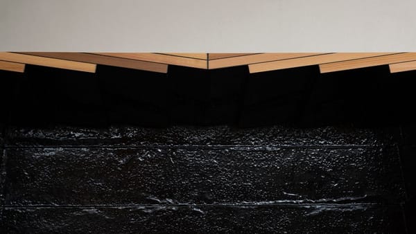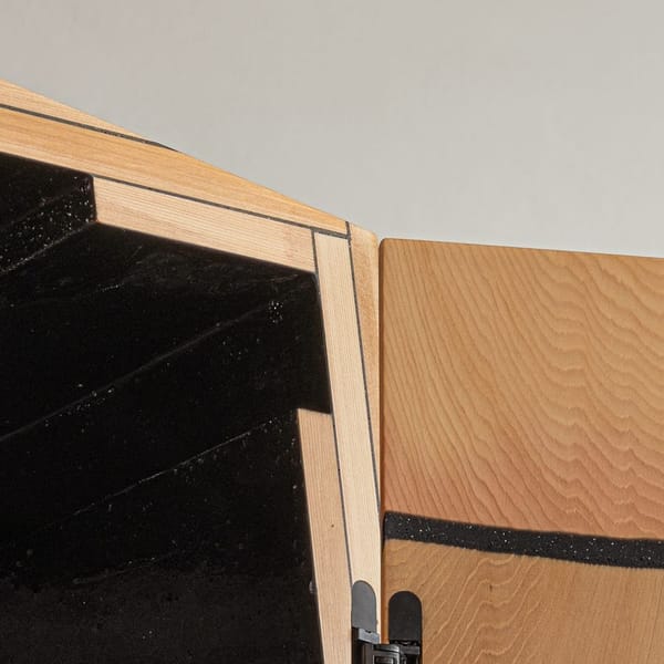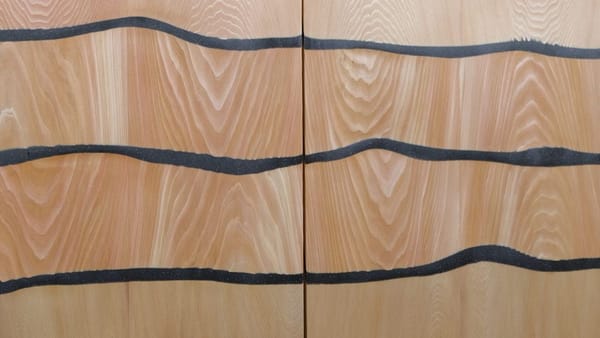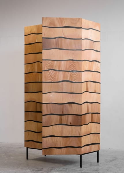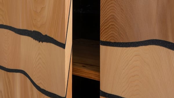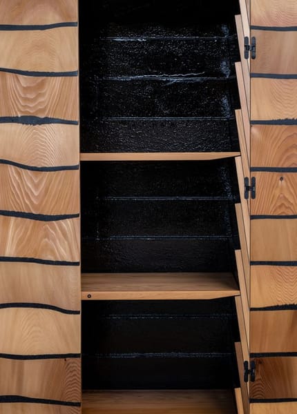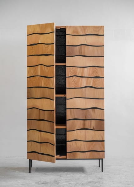 The Fuse cabinet is a contemporary exploration in decorative wood-craft. Cedar wood is layered on an angle with black marble and basalt in synthetic resin. The marble seems to ‘fuse’ into the cedar, winding in and around the cabinet while also holding it together. The organic lines give the resulting object a strong graphic presence.