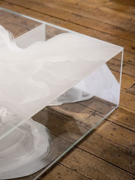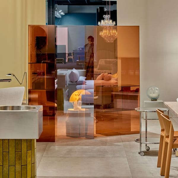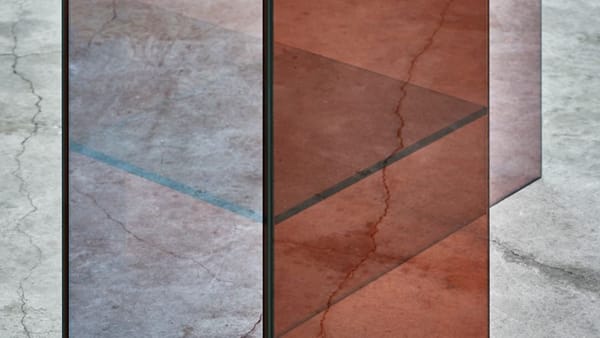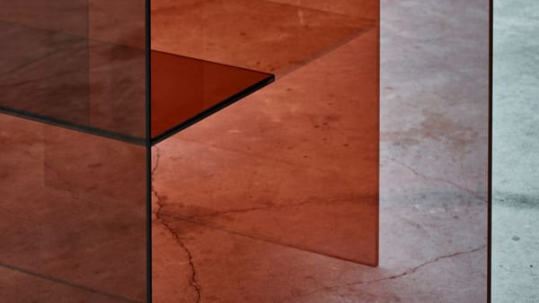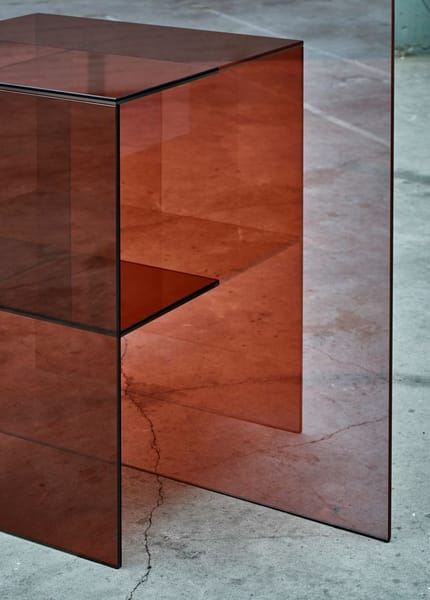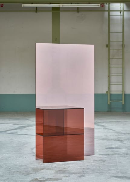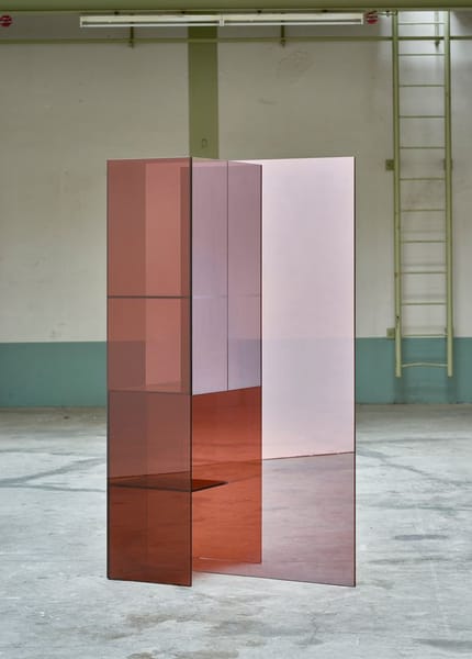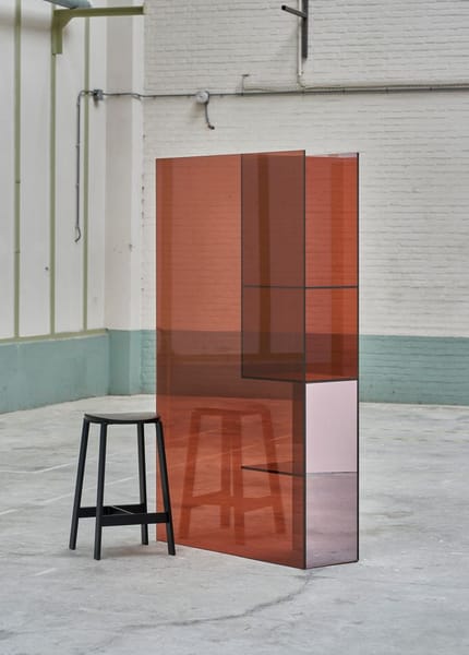 Taking cues from the fleeting tangibility of a mirage, these sculptural glass screens play with reflection, transparency and colour. Unconventional, abstract objects, they are a combination of room-divider, mirror and display shelf. The facets of semi-transparent glass are composed in a balance of soft colour and half-mirror.