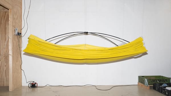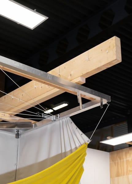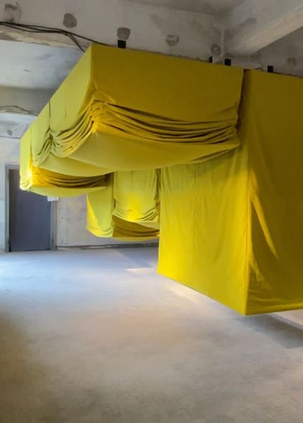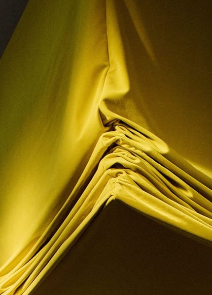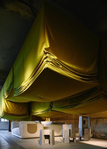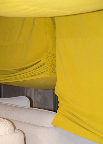 Inspired by the sumptuous, ruched upholstery on the presented sofa, Truly Truly conceived a breathing ceiling of textile volumes that echoed the sofa’s rippled detail as they raised and lowered into the space. Imposing in its scale and form, this kinetic sculpture obscured and revealed the works on show as it gradually breathed through the space.
