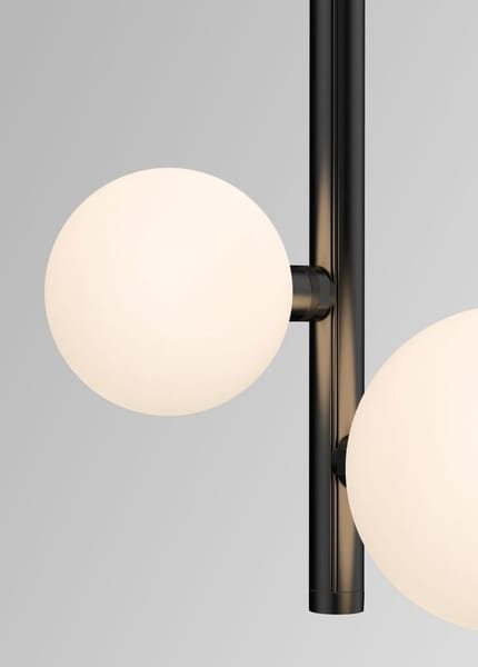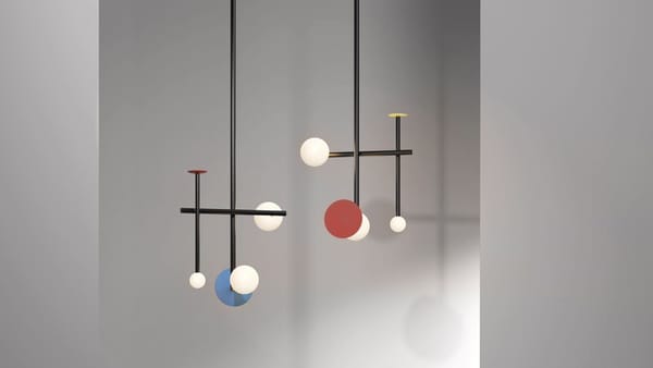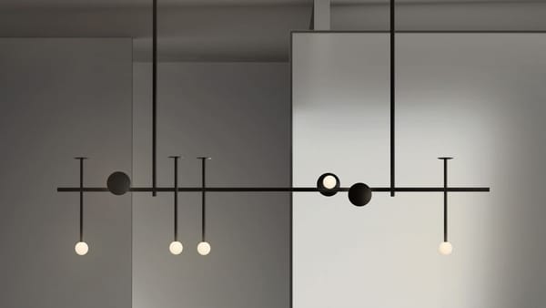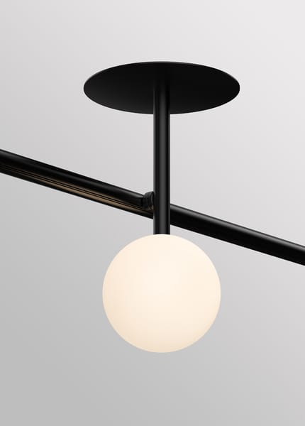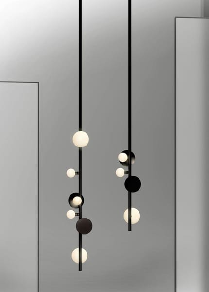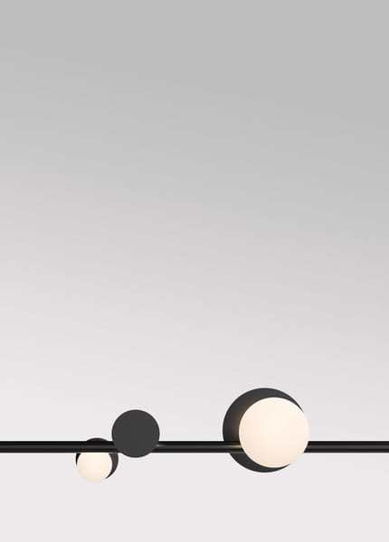VELA is the second iteration of the Typography family. Typography is a mix-and-match, decorative lighting system. This stand-alone lighting collection is a poetic mix of iconic design references and celestial contemplations. In reference to the VELA constellation, its spherically formed luminaires reinterpret the Typography rail system as the axis of an orbital space. Distinctive discs accent sculptural arrangements of spheres, creating forms and shadows reminiscent of eclipses.
